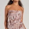 Make a stunning impression in this strapless floral midi dress designed with ruffled accents and a high side slit perfect for pairing with heels.